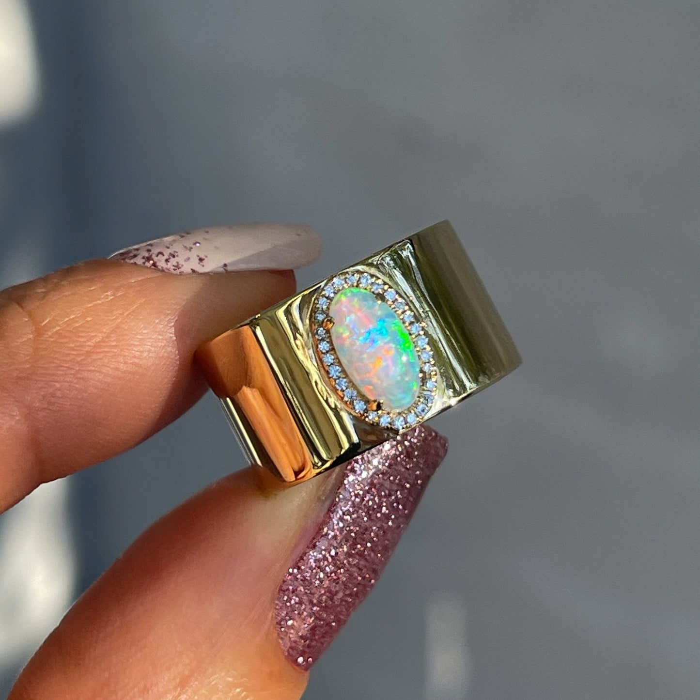This 14k gold band is just over 10mm wide, has softened edges and a polished finish. The oval opal rests atop the band in a prong setting with pave diamonds. Within the band an inscription awaits - a message intended exclusively for its owner. One of a kind opal and diamond ring.